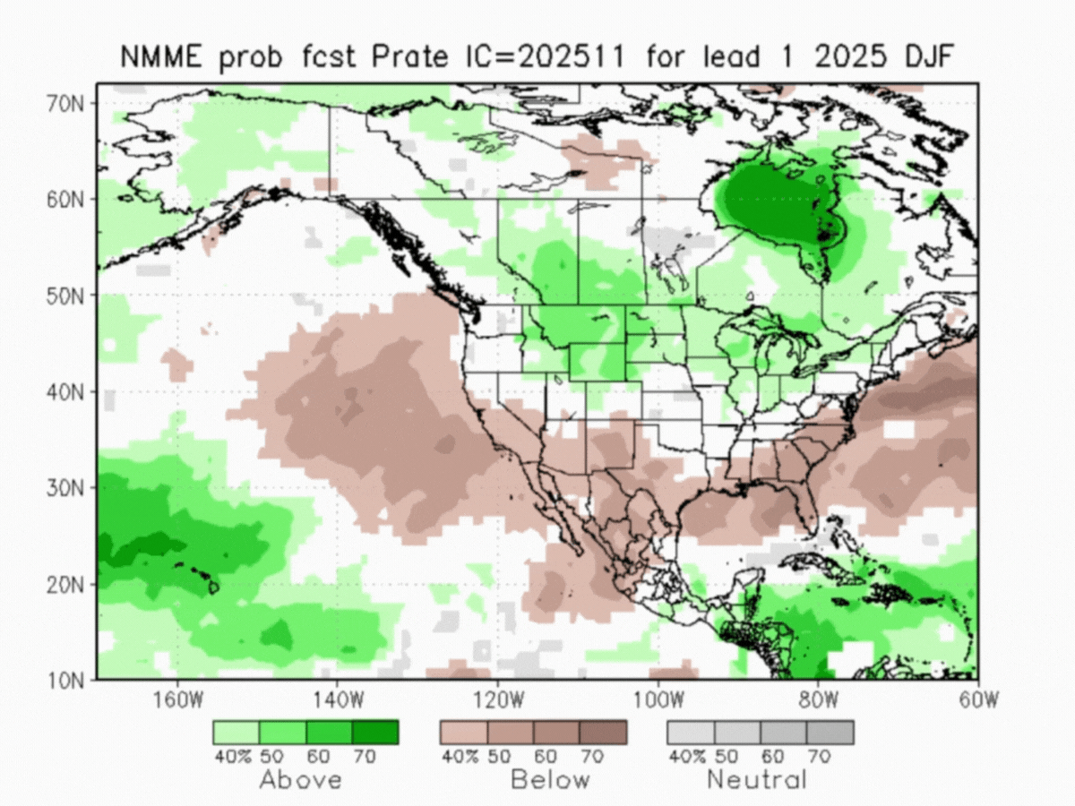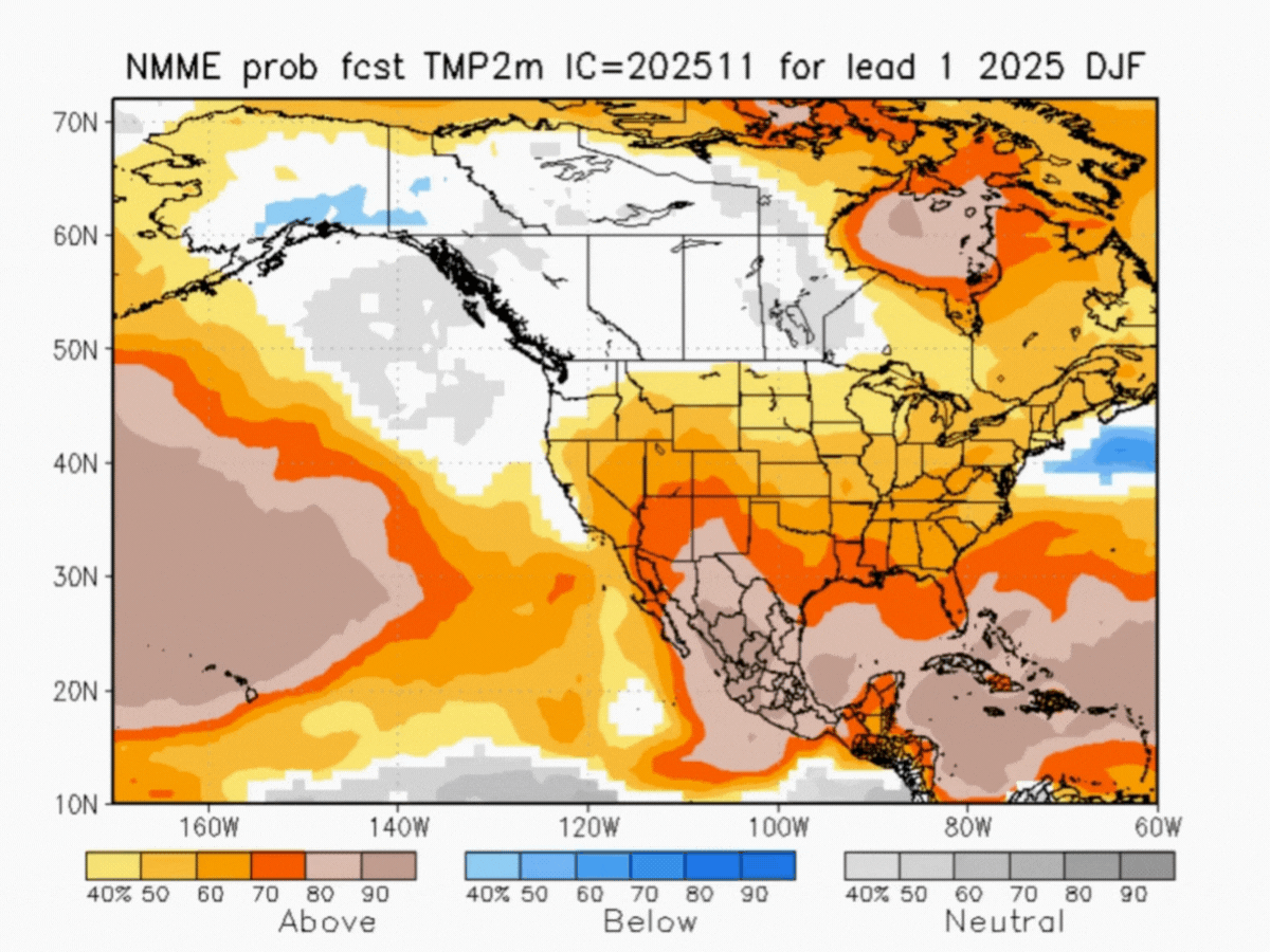 The seasonal outlook is influenced by the presence of a weak La Niña, which is expected to continue through February 2026. That could lead to increased precipitation and colder temperatures in Alberta, British Columbia, the Pacific Northwest, and northern California. Additionally, a weak polar vortex could disrupt the jet stream, leading to variable temperature cycles.