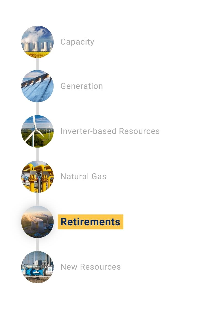 In 2024, entities retired 1.4 GW of generation capacity. Most of the retired capacity was coal (920 MW) and natural gas (413 MW). Coal retirements slowed in 2024, decreasing from 2 GW in 2022 and 1.2 GW in 2023. Over the next decade, entities plan to retire an additional 12 GW of coal, which accounts for 46% of the 26 GW of generation planned for retirement over the next 10 years.